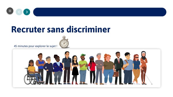 Découvrez le module « Recruter sans discriminer » : un parcours interactif qui vous apprend à relever les défis du recrutement inclusif. Dans un contexte professionnel en constante évolution, recruter de manière juste, équitable et inclusive est un enjeu essentiel pour toutes les organisations. Ce module a été conçu pour vous accompagner dans l’acquisition de connaissances et de compétences concrètes, afin de garantir un processus de recrutement respectueux du cadre légal, objectif dans l’évaluation, et ouvert à la diversité des talents.