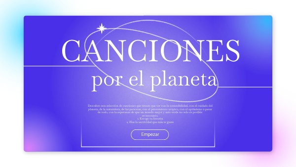 Descubre esta selección de canciones que tienen que ver con la sostenibilidad, con el cuidado del planeta, de la naturaleza, de las personas, con el pensamiento utópico, con el optimismo a pesarde todo, con la esperanza de que un mundo mejor y más verde no solo es posible: es necesario. 1. Escoge tu favorita 2. Haz la aactividad que más te guste