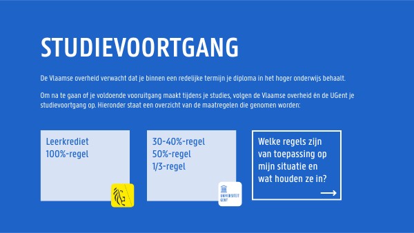 Om na te gaan of je voldoende vooruitgang maakt tijdens je studies, volgen de Vlaamse overheid én de UGent je studievoortgang op. Hieronder staat een overzicht van de maatregelen die genomen worden: