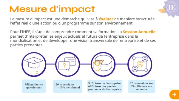 La mesure d'impact est une démarche qui vise à évaluer de manière structurée l'effet réel d'une action ou d'un programme sur son environnement. Pour l'IHEE, il s'agit de comprendre comment sa formation, la Session Annuelle, permet d’interpréter les enjeux actuels et futurs de l’entreprise dans la mondialisation et de développer une vision transversale de l’entreprise et de ses parties prenantes.