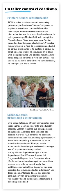 El Taller sobre edadismo: cómo detectarlo y prevenirlo que Fundación "la Caixa" impartirá en septiembre comienza por sensibilizar a los mayores para que sean conscientes de esa discriminación, sea de otros o de ellos mismos. La psicogerontóloga Montse Celdrán lo ejemplifica: “Cuando dicen: ‘Yo ya soy mayor para…’ están cayendo ellos mismos en el edadismo”. Y precisa: lo conveniente a la hora de rechazar una actividad es porque a uno nunca le ha gustado o porque su salud no se lo permite, no escudarse en la edad. Otro ejemplo: cuando una persona mayor camina sola y despacio se tiende a verla con lástima. Y sí, va sola y a su ritmo, pero tal vez no sufre soledad y no tiene por que andar rápido.