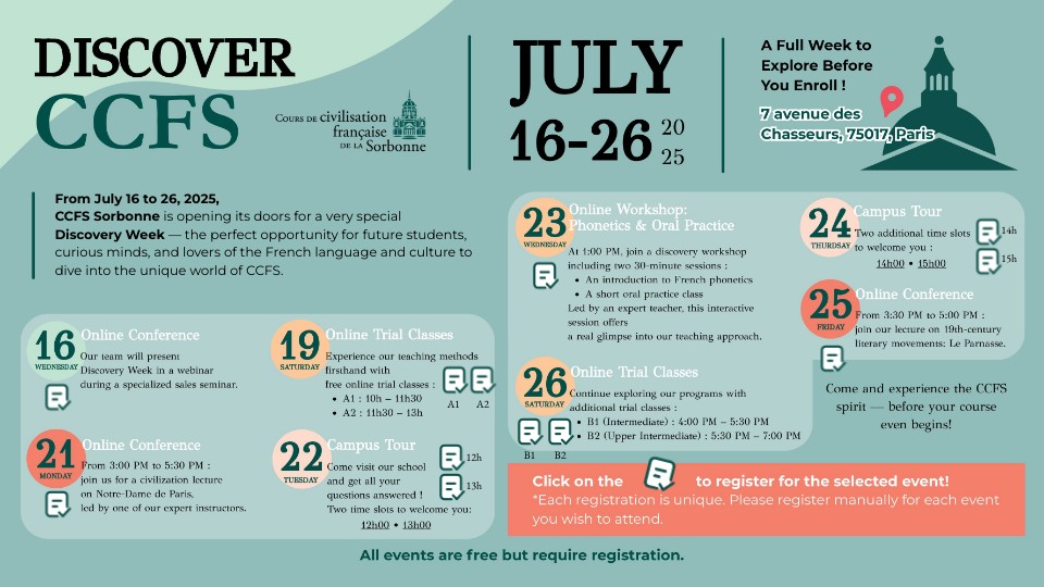 From July 16 to 26, 2025, CCFS Sorbonne is opening its doors for a very special Discovery Week — the perfect opportunity for future students, curious minds, and lovers of the French language and culture todive into the unique world of CCFS.