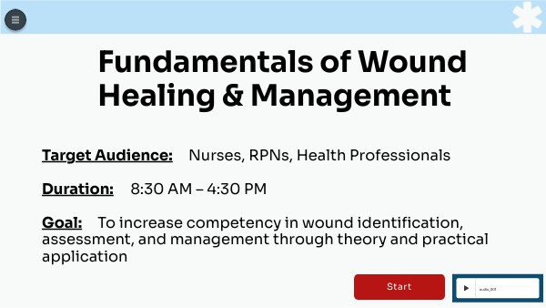 Welcome to the wound healing and management course, and thank you for joining us. This session is designed to support you in building confidence and skill in caring for patients with a wide range of wounds. Throughout the course, we will explore practical techniques, real-world scenarios, and evidence-informed practices that can strengthen your clinical judgment and enhance patient outcomes. We are glad you’re here and look forward to learning together in a supportive and engaging environment.