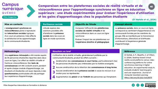 Pour citer ce document : Pôle d’expertise interordres en formation à distance (2025). Comparaison entre les plateformes sociales de réalité virtuelle et de visioconférence pour l’apprentissage synchrone en ligne en éducation supérieure : une étude expérimentale pour évaluer l’expérience d’utilisation et les gains d’apprentissages chez la population étudiante [Fiche de lecture de Desktop-based virtual reality social platforms versus video conferencing platforms for online synchronous learning in higher education : An experimental study to evaluate students’ learning gains and user experience. Journal of Computer Assisted Learning, par Di Natale, A. F., Repetto, C. et Villani, D., 2024]. Campus numérique Québec. Sous licence CC BY-NC-SA. https://view.genially.com/687153db2634eb8684f27b81