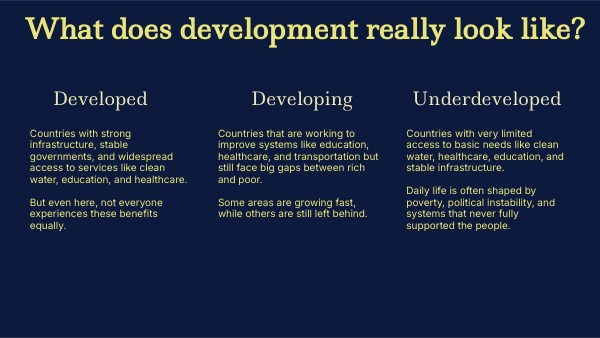 Explore. Compare. Create. Around the world, countries are often grouped as developed, developing, or underdeveloped. But what do those labels really mean? And how do they affect people’s daily lives? Your mission is to explore key topics of development — like access to clean water, education, healthcare, technology, and more — and compare how they differ across the three levels of development. Your Goals: Investigate real-world differences and challenges people face in each development level. Reflect on how history, inequality, and resilience shape communities. Choose a creative format to present your findings: - Google Slides presentation