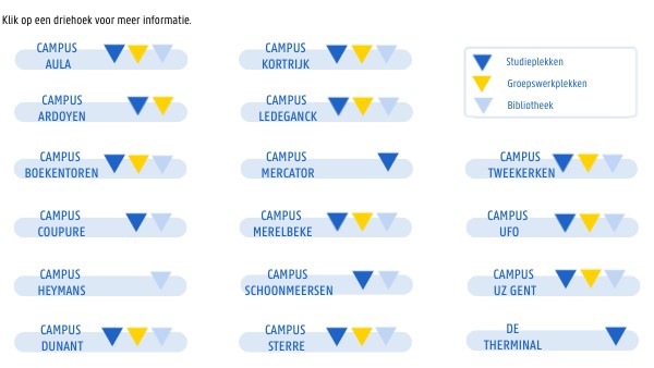 In de professorengang van de Boekentoren zijn 10 lokalen beschikbaar. In de faculteitsbibliotheek zijn er 8 kleine tot middelgrote werkplekken ter beschikking (5 in Magnel en 3 in Loveling). Deze groepswerkplekken zijn bruikbaar voor informele onderwijsactiviteiten in het kader van je studies (groepsopdrachten, besprekingen paper, kleinschalige vergaderingen of online meetings)