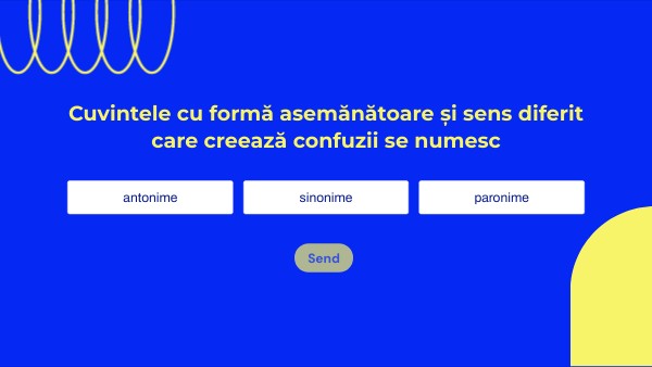 Exercițiul constă într-un quiz interactiv cu itemi de alegere multiplă și alegere duală, conceput pentru a verifica și consolida cunoștințele elevilor despre lexicul limbii române. Întrebările vizează noțiuni esențiale precum: sensul propriu și figurat, sinonime, antonime, omonime est.