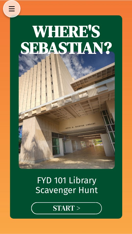 As part of the FYD 101 Library Guest Presentation, you are tasked with finding Sebastian, our college mascot. He is currently missing in the library, and you have to retrace his footsteps. The scavenger hunt will take 15 minutes. Your first stop is the Access Services desk. Once finished with the scavenger hunt, you can upload the completion certificate to Cane Commitment to receive credit!