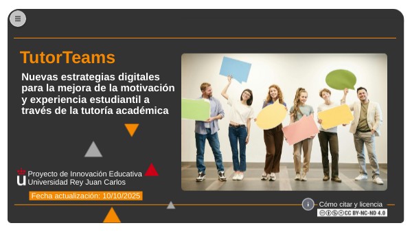 Alcolea Díaz, Gema; Sánchez Campos, Alberto; Cáceres Taladriz, César; López Bastías, José Luis; Borrás Gené, Oriol; Ros Martín, Irene (2025). Banco de buenas prácticas. TutorTeams. Nuevas estrategias digitales para la mejora de la motivación y experiencia estudiantil a través de la tutoría académica. https://view.genially.com/687532ece36180713e172aef Licenciado bajo Creative Commons Attribution-NonCommercial-NoDerivatives 4.0 International (CC BY-NC-ND 4.0.)