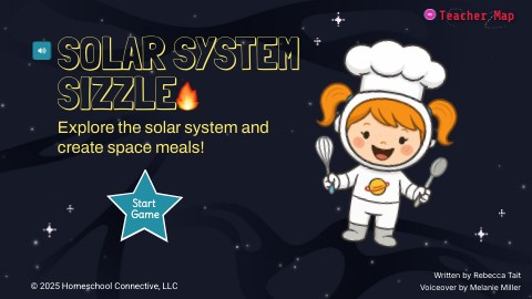 Solar System Sizzle is a great way for kids aged 5-7 to learn about the solar system. Each of the 24 solar system topics includes 3 simple facts as well as meals to create. Each lesson teaches kids about the solar system from the Sun all the way to Oort Cloud! Also included are lessons on telescopes, comets, and space stations. We do not create the lessons with the intent of aligning with Common Core Standards. All lessons are self-paced, kid-friendly, interactive, and secular, with voiceover built in. We recommend that you work through the lesson together with your child. You will also receive a set of worksheets to accompany the game for some hands-on, "off-screen" fun!