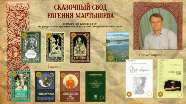 Поэзия Евгения Фёдоровича отличается горячей любовью к русскому слову, тонким лиризмом, яркой эмоциональностью и предельной искренностью. Сказки Е. Мартышева богаты не только увлекательным сюжетом. Они несут в себе мощный познавательный посыл. Перед мысленным взором читателя воскресает старинный уклад жизни и отчётливо слышится особый народный говор. Предлагаем вашему вниманию виртуальную книжную выставку Евгения Мартышева. Представленные книги вы можете найти в фонде отдела краеведения Мошковской центральной библиотеки.