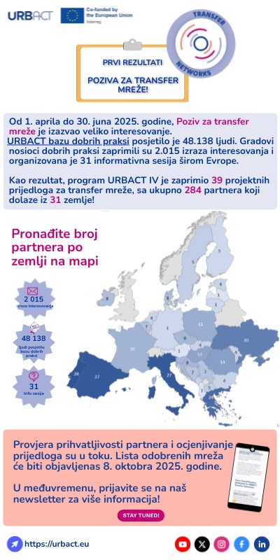 Od 1. aprila do 30. juna 2025. godine, Poziv za transfer mreže je izazvao veliko interesovanje. posjetilo je 48.138 ljudi. Gradovi nosioci dobrih praksi zaprimili su 2.015 izraza interesovanja i organizovana je 31 informativna sesija širom Evrope.Kao rezultat, program URBACT IV je zaprimio 39 projektnih prijedloga za transfer mreže, sa ukupno 284 partnera koji dolaze iz 31 zemlje!