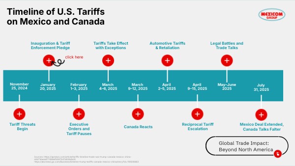 - April 2–3 — The U.S. launches the “Liberation Day” tariffs, including 25% tariffs on auto imports, impacting both Mexico and Canada.