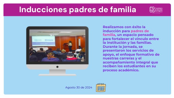 Realizamos con éxito la inducción para padres de familia, un espacio pensado para fortalecer el vínculo entre la institución y las familias. Durante la jornada, se presentaron los servicios de apoyo, el enfoque formativo de nuestras carreras y el acompañamiento integral que reciben los estudiantes en su proceso académico.
