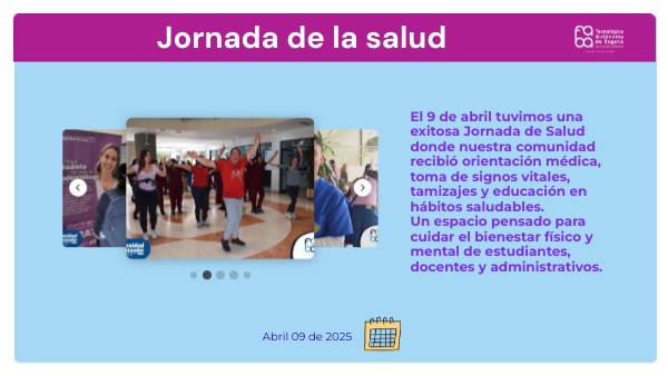 El 9 de abril tuvimos una exitosa Jornada de Salud donde nuestra comunidad recibió orientación médica, toma de signos vitales, tamizajes y educación en hábitos saludables. Un espacio pensado para cuidar el bienestar físico y mental de estudiantes, docentes y administrativos.