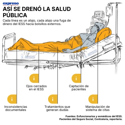 Fuentes: Exfuncionarios y exmédicos del IESS. Pacientes del Seguro Social, Contraloría, reportería.