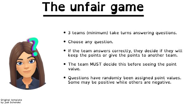 - If the team answers correctly, they decide if they will keep the points or give the points to another team.