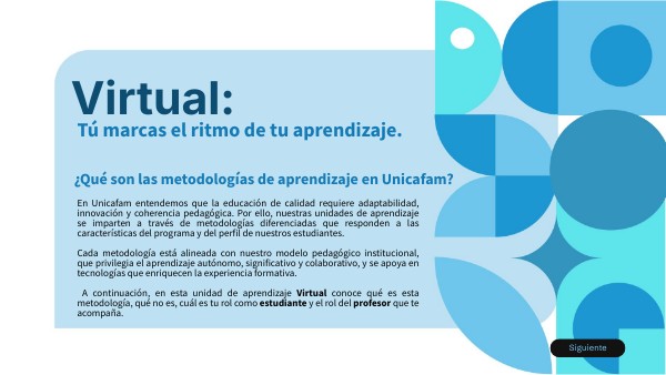 En Unicafam entendemos que la educación de calidad requiere adaptabilidad, innovación y coherencia pedagógica. Por ello, nuestras unidades de aprendizaje se imparten a través de metodologías diferenciadas que responden a las características del programa y del perfil de nuestros estudiantes. Cada metodología está alineada con nuestro modelo pedagógico institucional, que privilegia el aprendizaje autónomo, significativo y colaborativo, y se apoya en tecnologías que enriquecen la experiencia formativa. A continuación, en esta unidad de aprendizaje Virtual conoce qué es esta metodología, qué no es, cuál es tu rol como estudiante y el rol del profesor que te acompaña.