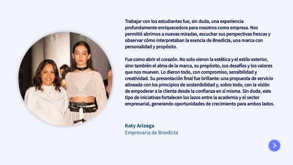 Trabajar con los estudiantes fue, sin duda, una experiencia profundamente enriquecedora para nosotros como empresa. Nos permitió abrirnos a nuevas miradas, escuchar sus perspectivas frescas y observar cómo interpretaban la esencia de Bnedicta, una marca con personalidad y propósito. Fue como abrir el corazón. No solo vieron la estética y el estilo exterior, sino también el alma de la marca, su propósito, sus desafíos y los valores que nos mueven. Lo dieron todo, con compromiso, sensibilidad y creatividad. Su presentación final fue brillante: una propuesta de servicio alineada con los principios de sostenibilidad y, sobre todo, con la visión de empoderar a la clienta desde la confianza en sí misma. Sin duda, este tipo de iniciativas fortalecen los lazos entre la academia y el sector empresarial, generando oportunidades de crecimiento para ambos lados.