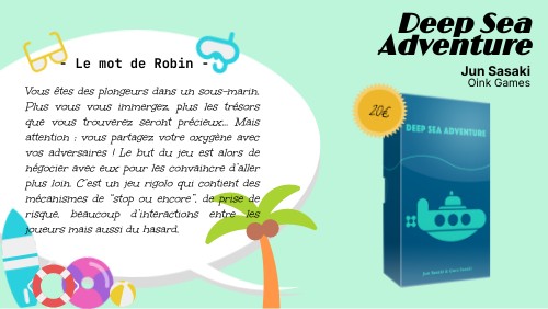 Vous êtes des plongeurs dans un sous-marin. Plus vous vous immergez, plus les trésors que vous trouverez seront précieux... Mais attention : vous partagez votre oxygène avec vos adversaires ! Le but du jeu est alors de négocier avec eux pour les convaincre d’aller plus loin. C’est un jeu rigolo qui contient des mécanismes de “stop ou encore”, de prise de risque, beaucoup d’interactions entre les joueurs mais aussi du hasard.