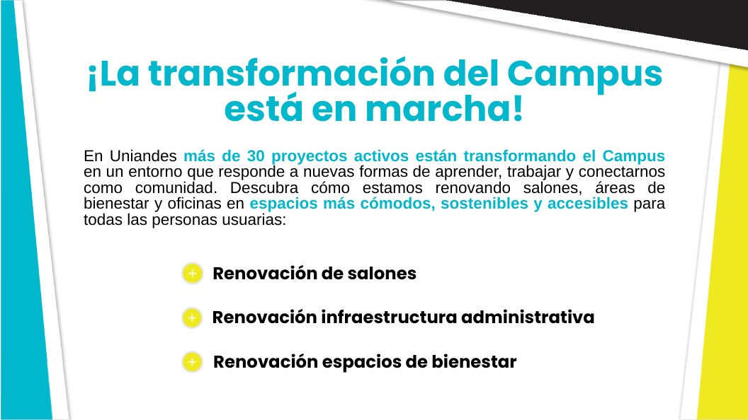 En Uniandes más de 30 proyectos activos están transformando el Campus en un entorno que responde a nuevas formas de aprender, trabajar y conectarnos como comunidad. Descubra cómo estamos renovando salones, áreas de bienestar y oficinas en espacios más cómodos, sostenibles y accesibles para todas las personas usuarias: