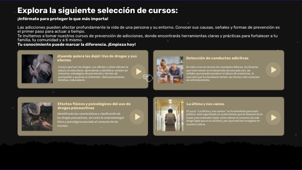 ¡Infórmate para proteger lo que más importa! Las adicciones pueden afectar profundamente la vida de una persona y su entorno. Conocer sus causas, señales y formas de prevención es el primer paso para actuar a tiempo. Te invitamos a tomar nuestros cursos de prevención de adicciones, donde encontrarás herramientas claras y prácticas para fortalecer a tu familia, tu comunidad y a ti mismo. Tu conocimiento puede marcar la diferencia. ¡Empieza hoy!