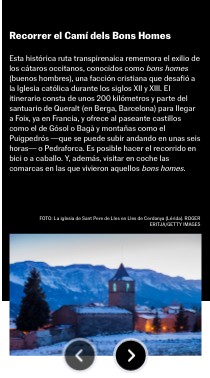 Esta histórica ruta transpirenaica rememora el exilio de los cátaros occitanos, conocidos como bons homes (buenos hombres), una facción cristiana que desafió a la Iglesia católica durante los siglos XII y XIII. El itinerario consta de unos 200 kilómetros y parte del santuario de Queralt (en Berga, Barcelona) para llegar a Foix, ya en Francia, y ofrece al paseante castillos como el de Gósol o Bagà y montañas como el Puigpedrós —que se puede subir andando en unas seis horas— o Pedraforca. Es posible hacer el recorrido en bici o a caballo. Y, además, visitar en coche las comarcas en las que vivieron aquellos bons homes.