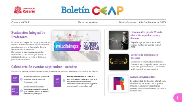 El Centro de Enseñanza, Aprendizaje y Trayectoria Profesoral (CEAP) y la Dirección de Educación Digital de la Universidad del Rosario, como centros líderes de la Red de Centros de Enseñanza y Aprendizaje en Educación Superior (REDCREA), fueron protagonistas principales en la gestión y desarrollo del evento “3 dIAS Inteligencia Artificial para la Innovación Educativa”, realizado de manera virtual los días 3, 4 y 5 de septiembre. Durante tres jornadas, docentes de distintas instituciones del país participaron en conferencias, webinars, talleres prácticos y retos gamer, explorando cómo la IA potencia la labor docente y abre nuevas oportunidades para la educación superior. El encuentro abordó temáticas clave como el impacto de la IA en la educación, los retos de adaptación, y la creación de contenidos de alto valor, consolidando al CEAP y a la DED como referentes en la promoción de la innovación pedagógica en el país. Si deseas revivir las conferencias y talleres en diferido, puedes acceder a los contenidos en la página oficial del evento: https://redcrea.eafit.edu.co/