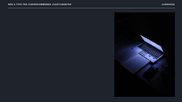 Prioriter å lær juridisk metode! Juridisk metode er noe du får bruk for gjennom hele jusstudiet. Mestrer du den juridiske metoden skal du klare å løse de fleste juridiske problemstillinger. Foruten det, vil jeg tipse om å møte opp i forelesninger. Gjennom å delta på forelesninger forstår du faget på en helt annen måte. Det er i tillegg sosialt!