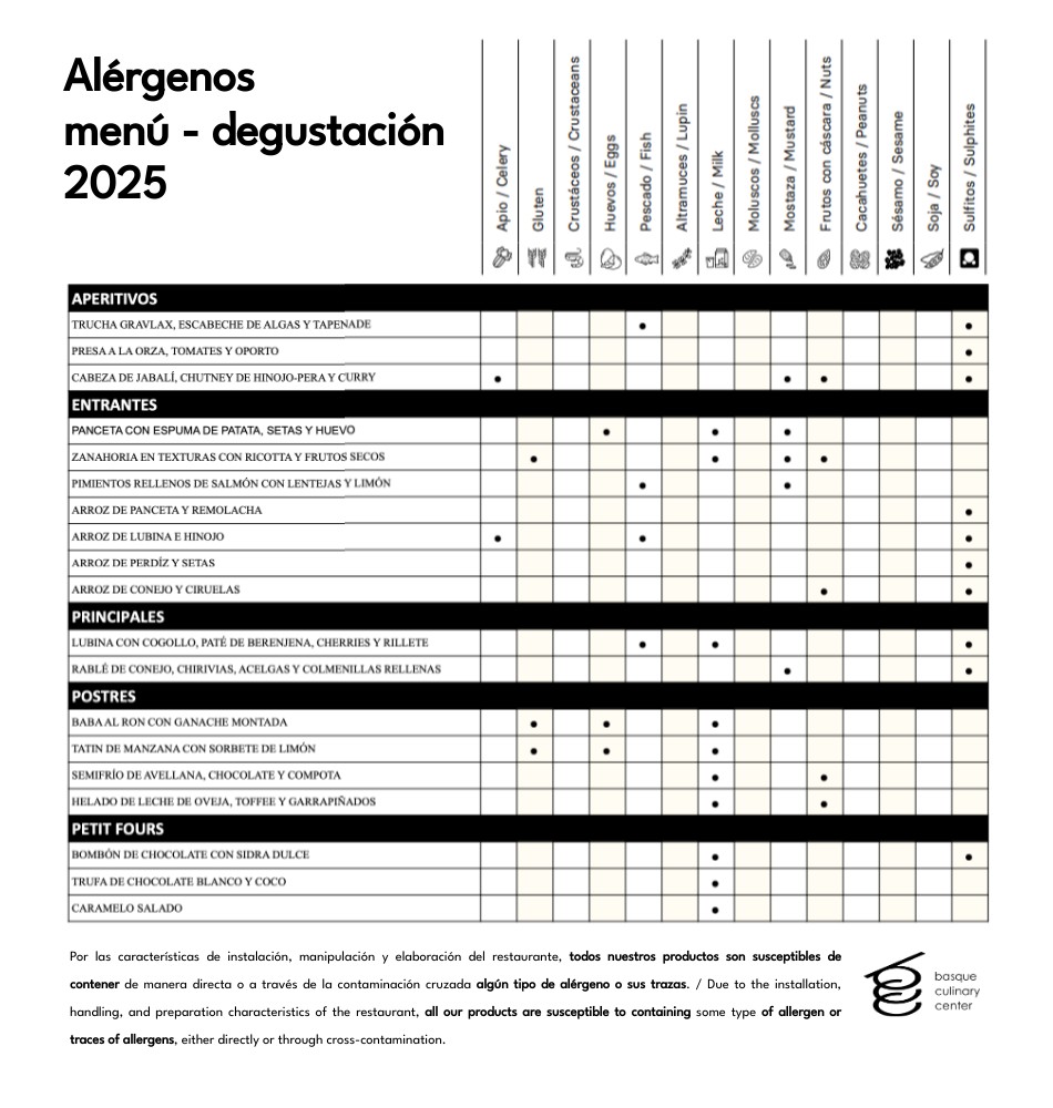 Por las características de instalación, manipulación y elaboración del restaurante, todos nuestros productos son susceptibles de contener de manera directa o a través de la contaminación cruzada algún tipo de alérgeno o sus trazas. / Due to the installation, handling, and preparation characteristics of the restaurant, all our products are susceptible to containing some type of allergen or traces of allergens, either directly or through cross-contamination.