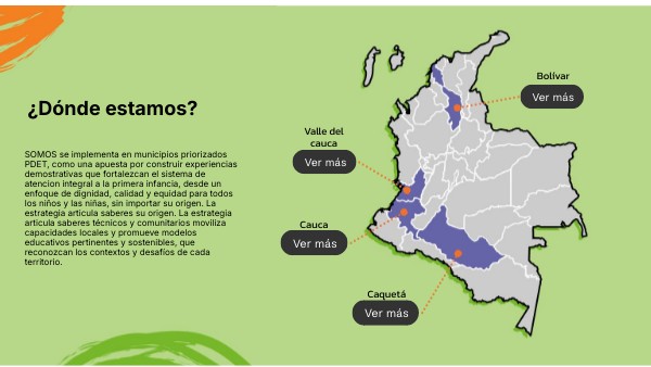 SOMOS se implementa en municipios priorizados PDET, como una apuesta por construir experiencias demostrativas que fortalezcan el sistema de atencion integral a la primera infancia, desde un enfoque de dignidad, calidad y equidad para todos los niños y las niñas, sin importar su origen. La estrategia articula saberes su origen. La estrategia articula saberes técnicos y comunitarios moviliza capacidades locales y promueve modelos educativos pertinentes y sostenibles, que reconozcan los contextos y desafíos de cada territorio.