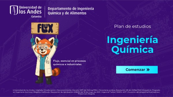 Universidad de los Andes | Vigilada Mineducación | Reconocimiento: Decreto 1297 del 30/may/1964 | Personería jurídica: Resolución 28 del 23/feb/1949 Minjusticia. Pregrado en Ingeniería Química | Registro Calificado: Resolución de Aprobación 008232 del 18 de mayo de 2021 | Vigencia 7 años | SNIES: 4017 | Duración del programa 8 semestres | Presencial | Bogotá.