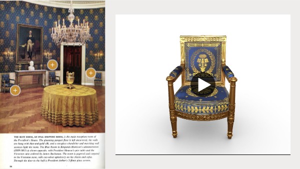 This page of The White House: An Historic Guide captures the history of the Bellangé armchair and suite in the Blue Room of the White House.