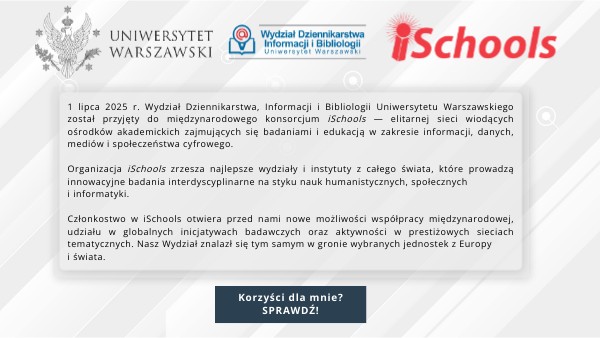 1 lipca 2025 r. Wydział Dziennikarstwa, Informacji i Bibliologii Uniwersytetu Warszawskiego został przyjęty do międzynarodowego konsorcjum iSchools — elitarnej sieci wiodących ośrodków akademickich zajmujących się badaniami i edukacją w zakresie informacji, danych, mediów i społeczeństwa cyfrowego. Organizacja iSchools zrzesza najlepsze wydziały i instytuty z całego świata, które prowadzą innowacyjne badania interdyscyplinarne na styku nauk humanistycznych, społecznych i informatyki. Członkostwo w iSchools otwiera przed nami nowe możliwości współpracy międzynarodowej, udziału w globalnych inicjatywach badawczych oraz aktywności w prestiżowych sieciach tematycznych. Nasz Wydział znalazł się tym samym w gronie wybranych jednostek z Europy i świata.