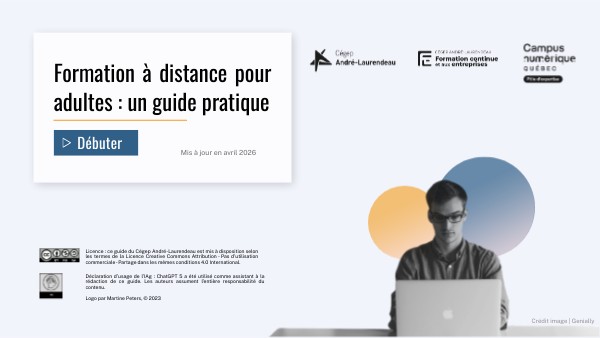 La formation des adultes exige une attention particulière aux besoins, aux parcours et à l’autonomie des personnes apprenantes, dont l’engagement repose en grande partie sur la pertinence des apprentissages. Dans un contexte de formation à distance, comme nous l'avons vu tout au long de ce guide, cette attention devient d’autant plus essentielle que les personnes apprenantes évoluent souvent de manière autonome, à partir de réalités personnelles et professionnelles diversifiées. Étant donné que les pratiques pédagogiques en FAD évoluent à grande vitesse, nous avons l'intention de mettre à jour ce guide régulièrement. Pour ce faire, nous comptons sur votre précieuse collaboration. Nous vous invitons donc à partager vos commentaires et suggestions afin de nous aider à enrichir et à améliorer la présente ressource. Si vous êtes conseillère ou conseiller pédagogique et souhaitez utiliser ce guide en l’adaptant à l’identité visuelle de votre établissement, n'hésitez pas à en faire une copie en cliquant sur le symbole qui s'affiche en bas à droite de l'écran. Nous espérons que cette ressource vous a permis de réfléchir à vos pratiques pédagogiques et vous a donné le goût de poursuivre l'exploration des sujets qu'elle aborde. Paulo Mendonça | Vanitha Pillay