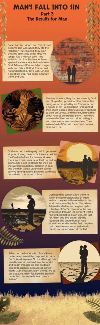 God could no longer allow them to live in the perfect paradise of Eden. Instead they would have to live in the world now ruled by Satan. Yes, when Adam decided to sin, he gave up his rulership of God's creation to the one who spoke through the serpent. That's how critical that decision was, not just for Adam and Eve but for all who followed. The entire human race would descend from the first couple—that means everyone would inherit the sin nature acquired at the Fall.