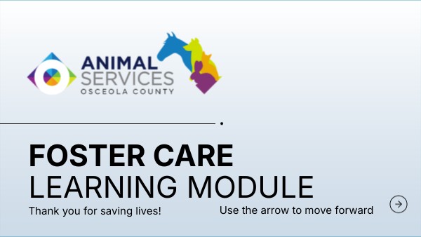 Thank you for your interest in becoming a foster caregiver with Osceola County Animal Services. We truly value your dedication to supporting both the animals and our organization. This module provides an overview of