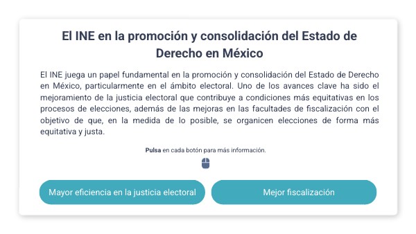 El INE juega un papel fundamental en la promoción y consolidación del Estado de Derecho en México, particularmente en el ámbito electoral. Uno de los avances clave ha sido el mejoramiento de la justicia electoral que contribuye a condiciones más equitativas en los procesos de elecciones, además de las mejoras en las facultades de fiscalización con el objetivo de que, en la medida de lo posible, se organicen elecciones de forma más equitativa y justa.