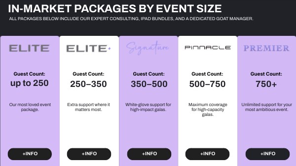 GOAT Pinnacle is built for large-scale events where guest volume, timing, and donor experience all matter. With 11 trained specialists plus your onsite GOAT, this package is designed to eliminate bottlenecks and keep every moment—from check-in to checkout—running seamlessly.