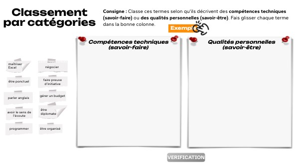 Consigne : Classe ces termes selon qu'ils décrivent des compétences techniques (savoir-faire) ou des qualités personnelles (savoir-être). Fais glisser chaque terme dans la bonne colonne.