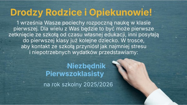 1 września Wasze pociechy rozpoczną naukę w klasie pierwszej. Dla wielu z Was będzie to być może pierwsze zetknięcie ze szkołą od czasu własnej edukacji, inni posyłają do pierwszej klasy już kolejne dziecko. W trosce, aby kontakt ze szkołą przyniósł jak najmniej stresu i niepotrzebnych wydatków przedstawiamy: