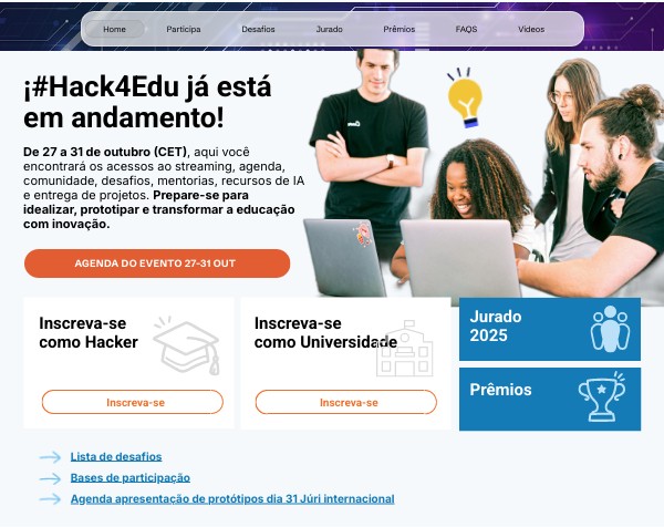 De 27 a 31 de outubro (CET), aqui você encontrará os acessos ao streaming, agenda, comunidade, desafios, mentorias, recursos de IA e entrega de projetos. Prepare-se para idealizar, prototipar e transformar a educação com inovação.