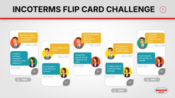 Cómo jugar: Da vuelta la tarjeta y selecciona el Incoterm correcto que corresponde a la situación.
