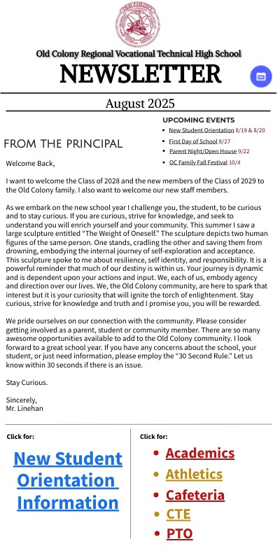 Welcome Back, I want to welcome the Class of 2028 and the new members of the Class of 2029 to the Old Colony family. I also want to welcome our new staff members. As we embark on the new school year I challenge you, the student, to be curious and to stay curious. If you are curious, strive for knowledge, and seek to understand you will enrich yourself and your community. This summer I saw a large sculpture entitled “The Weight of Oneself.” The sculpture depicts two human figures of the same person. One stands, cradling the other and saving them from drowning, embodying the internal journey of self-exploration and acceptance. This sculpture spoke to me about resilience, self identity, and responsibility. It is a powerful reminder that much of our destiny is within us. Your journey is dynamic and is dependent upon your actions and input. We, each of us, embody agency and direction over our lives. We, the Old Colony community, are here to spark that interest but it is your curiosity that will ignite the torch of enlightenment. Stay curious, strive for knowledge and truth and I promise you, you will be rewarded. We pride ourselves on our connection with the community. Please consider getting involved as a parent, student or community member. There are so many awesome opportunities available to add to the Old Colony community. I look forward to a great school year. If you have any concerns about the school, your student, or just need information, please employ the “30 Second Rule.” Let us know within 30 seconds if there is an issue. Stay Curious. Sincerely, Mr. Linehan