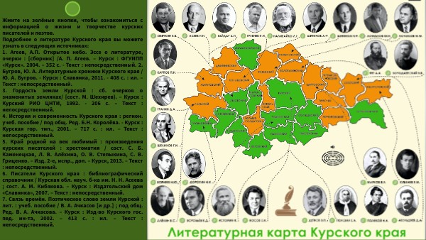Жмите на зелёные кнопки, чтобы ознакомиться с информацией о жизни и творчестве курских писателей и поэтов. Подробнее о литературе Курского к