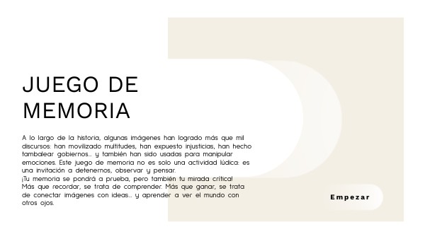 A lo largo de la historia, algunas imágenes han logrado más que mil discursos: han movilizado multitudes, han expuesto injusticias, han hecho tambalear gobiernos… y también han sido usadas para manipular emociones. Este juego de memoria no es solo una actividad lúdica: es una invitación a detenernos, observar y pensar. ¡Tu memoria se pondrá a prueba, pero también tu mirada crítica! Más que recordar, se trata de comprender. Más que ganar, se trata de conectar imágenes con ideas… y aprender a ver el mundo con otros ojos.