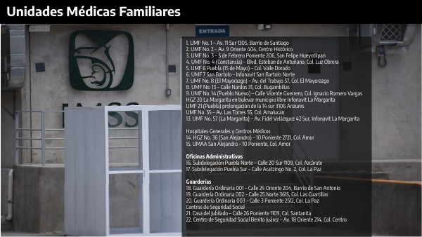 1. UMF No. 1 – Av. 11 Sur 1305, Barrio de Santiago 2. UMF No. 2 – Av. 9 Oriente 404, Centro Histórico 3. UMF No. 3 – 5 de Febrero Poniente 206, San Felipe Hueyotlipan 4. UMF No. 4 (Constancia) – Blvd. Esteban de Antuñano, Col. Luz Obrera 5. UMF 6 Puebla (15 de Mayo) – Col. Valle Dorado 6. UMF 7 San Bartolo – Infonavit San Bartolo Norte 7. UMF No. 8 (El Mayorazgo) – Av. del Trabajo 57, Col. El Mayorazgo 8. UMF No. 13 – Calle Nardos 31, Col. Bugambilias 9. UMF No. 14 (Pueblo Nuevo) – Calle Vicente Guerrero, Col. Ignacio Romero Vargas HGZ 20 La Margarita en bulevar municipio libre Infonavit La Margarita UMF 21 (Puebla) prolongación de la 14 sur 3106 Anzures UMF No. 55 – Av. Las Torres 55, Col. Amalucan 13. UMF No. 57 (La Margarita) – Av. Fidel Velázquez 42 Sur, Infonavit La Margarita Hospitales Generales y Centros Médicos 14. HGZ No. 36 (San Alejandro) – 10 Poniente 2721, Col. Amor 15. UMAA San Alejandro – 10 Poniente, Col. Amor Oficinas Administrativas 16. Subdelegación Puebla Norte – Calle 20 Sur 1109, Col. Azcárate 17. Subdelegación Puebla Sur – Calle Acatzingo No. 2, Col. La Paz Guarderías 18. Guardería Ordinaria 001 – Calle 24 Oriente 204, Barrio de San Antonio 19. Guardería Ordinaria 002 – Calle 25 Norte 3615, Col. Las Cuartillas 20. Guardería Ordinaria 003 – Calle 3 Poniente 2512, Col. La Paz Centros de Seguridad Social 21. Casa del Jubilado – Calle 26 Poniente 1109, Col. Santanita 22. Centro de Seguridad Social Benito Juárez – Av. 18 Oriente 214, Col. Centro
