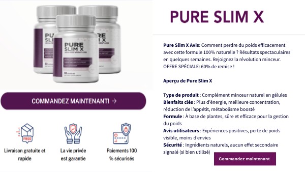 Pure Slim X Avis: Comment perdre du poids efficacement avec cette formule 100% naturelle ? Résultats spectaculaires en quelques semaines. Rejoignez la révolution minceur. OFFRE SPÉCIALE: 60% de remise ! Aperçu de Pure Slim X Type de produit : Complément minceur naturel en gélules Bienfaits clés : Plus d’énergie, meilleure concentration, réduction de l’appétit, métabolisme boosté Formule : À base de plantes, sûre et efficace pour la gestion du poids Avis utilisateurs : Expériences positives, perte de poids visible, moins d’envies Sécurité : Ingrédients naturels, aucun effet secondaire signalé (si bien utilisé)
