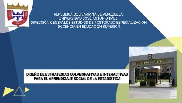 Objetivo General Proponer estrategias colaborativas e interactivas para el aprendizaje social de la Estadística I, en la Dirección General de Estudios Básicos y Generales de la Universidad José Antonio Páez, que promueva el proceso de aprendizaje compartido en la modalidad presencial con apoyo en la virtualidad.