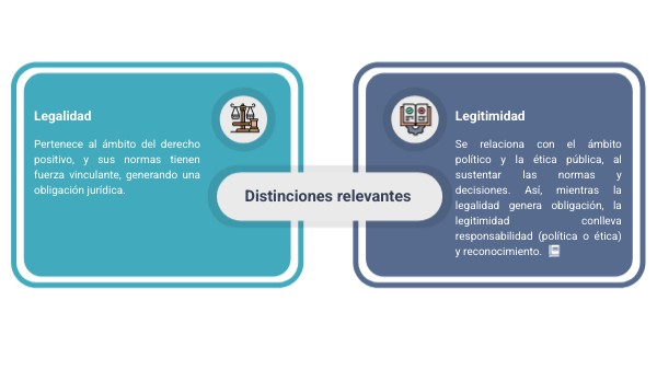 Se relaciona con el ámbito político y la ética pública, al sustentar las normas y decisiones. Así, mientras la legalidad genera obligación, la legitimidad conlleva responsabilidad (política o ética) y reconocimiento.